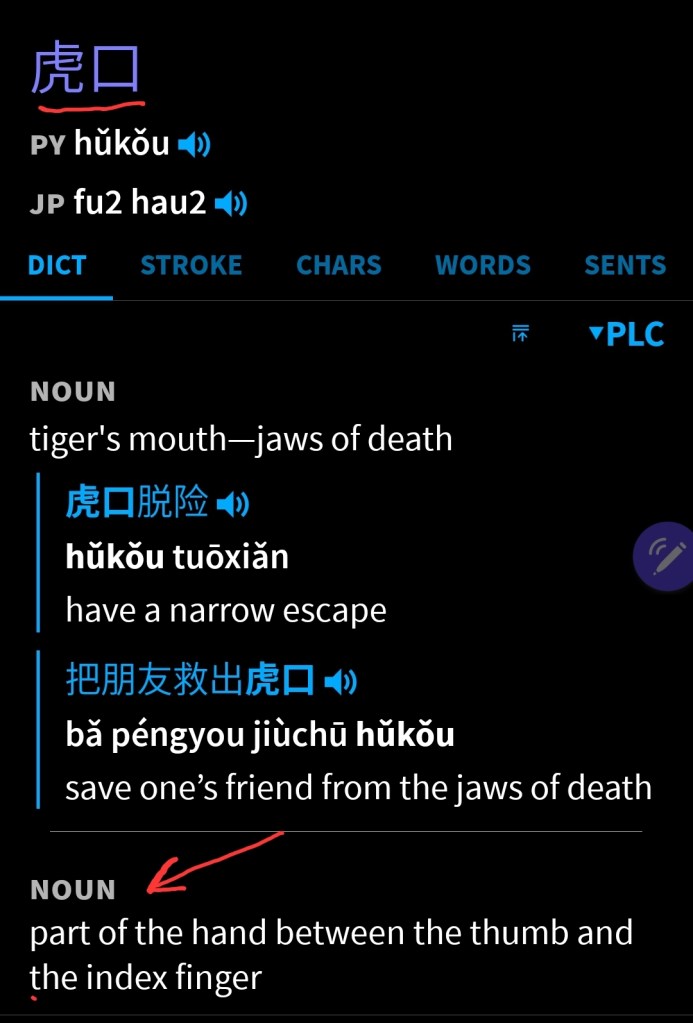 编汉英词典的前辈们,都用描述法定义“虎口”,但似乎没给出“虎口”的直接对应词,而且分别用 part/space/region/web/joint 指那个部位。
