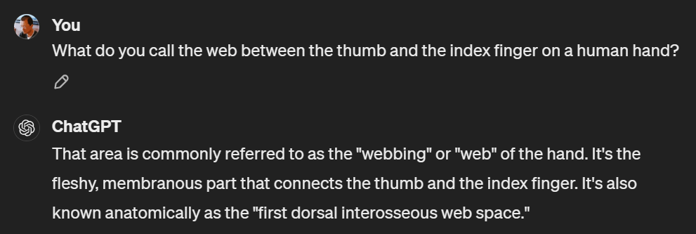 如今查术语,容易多了。我们知道,手指之间的“蹼”状物,统称为 web,那就可以用 web 作为关键词提问:”What do you call the web between the thumb and the index finger?” 但我假装不知道,将线索降到最低,看谷歌能给出什么答案。